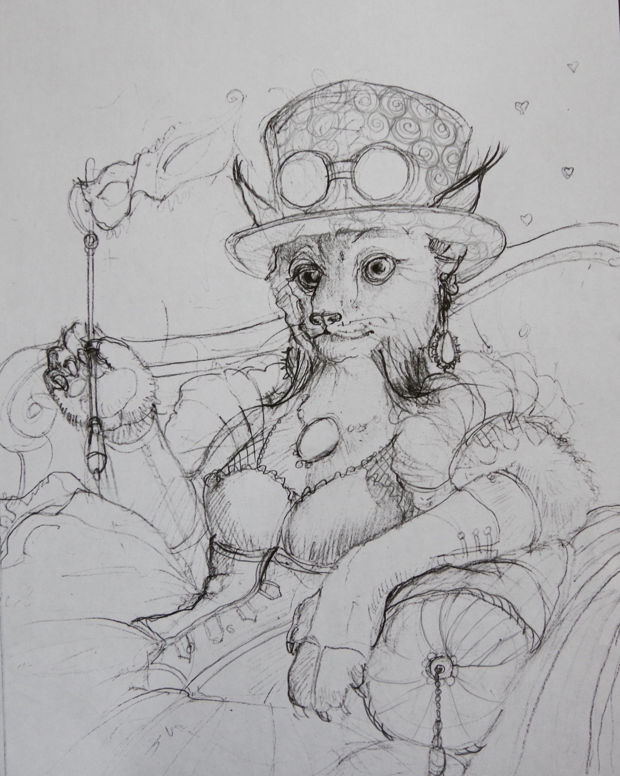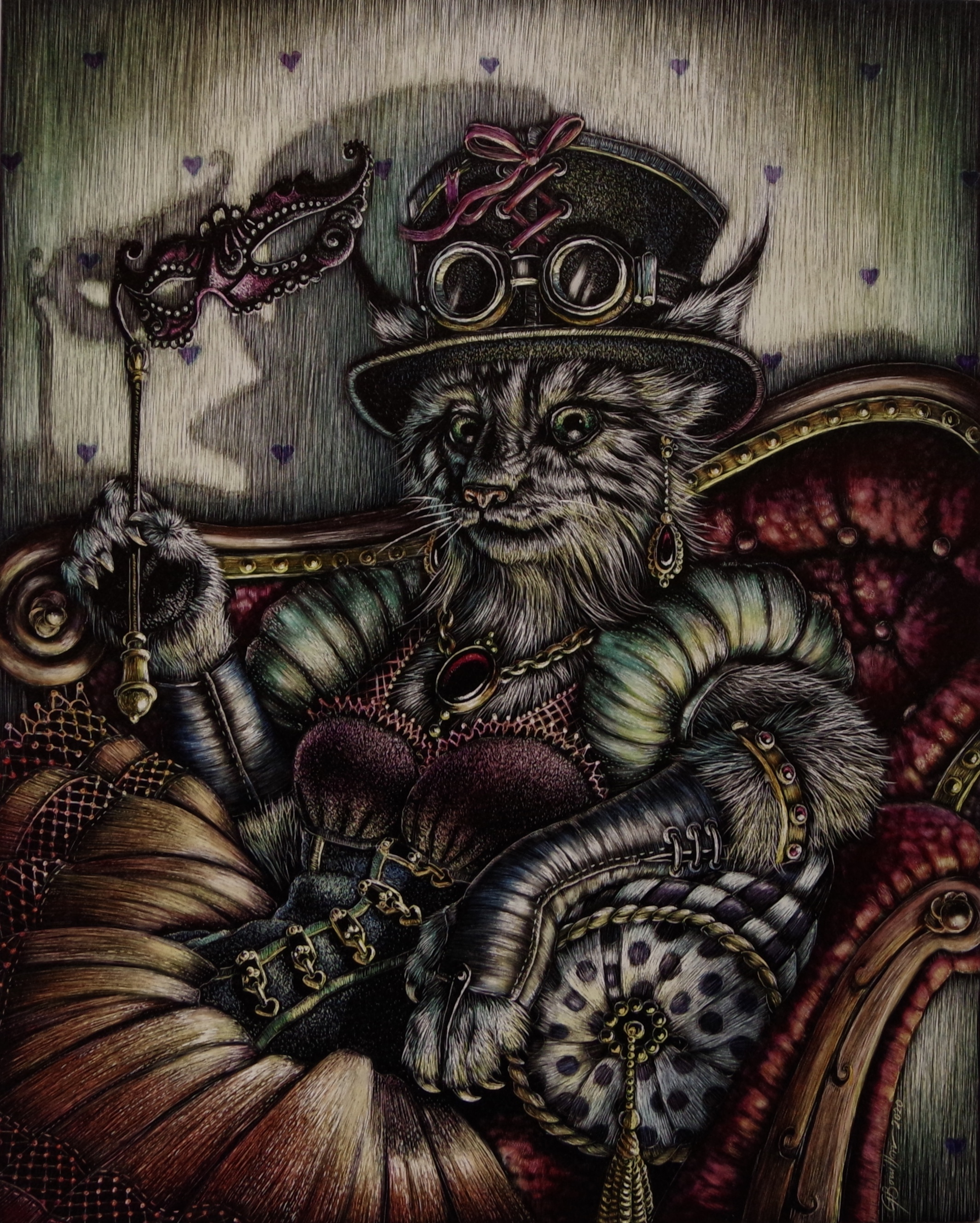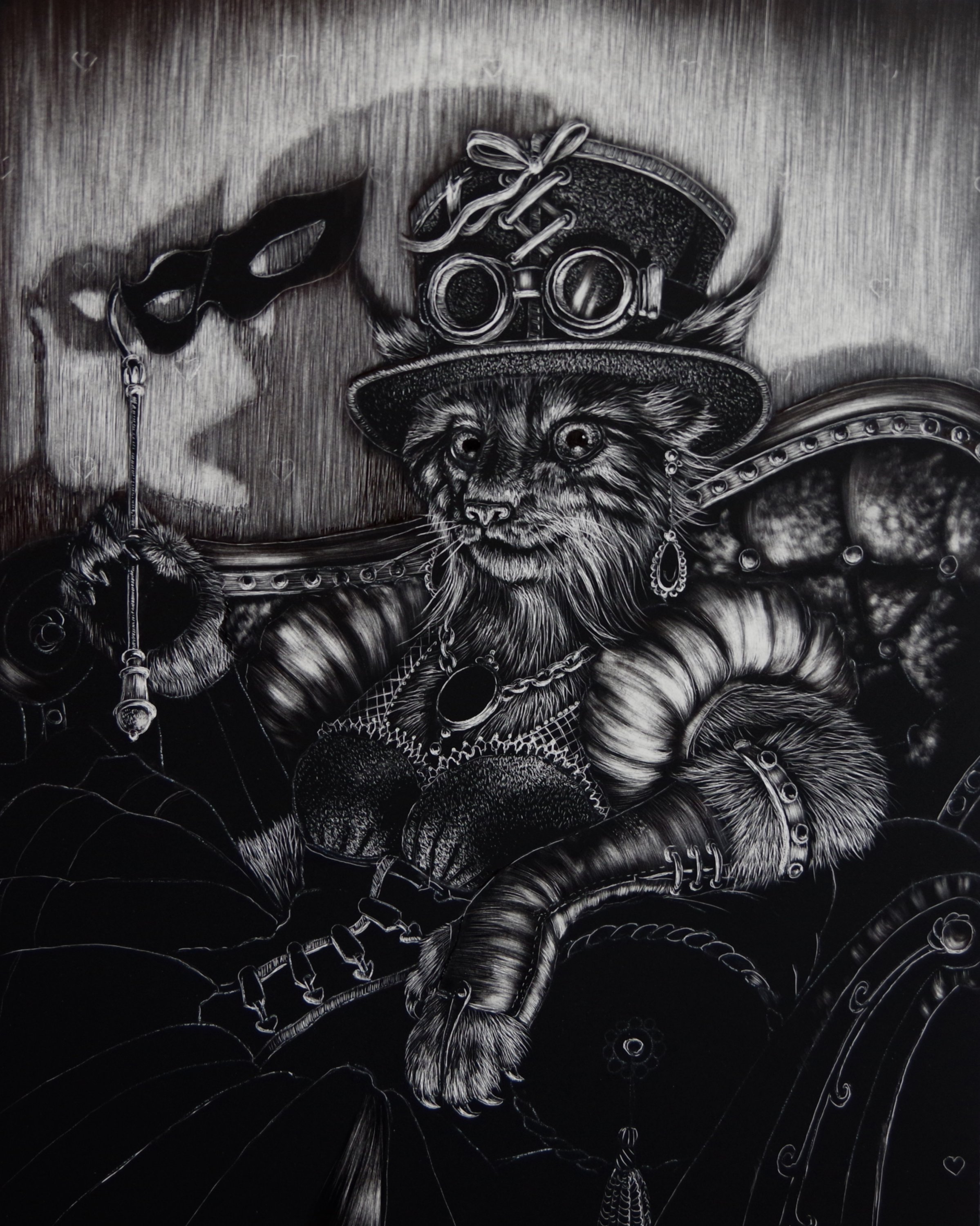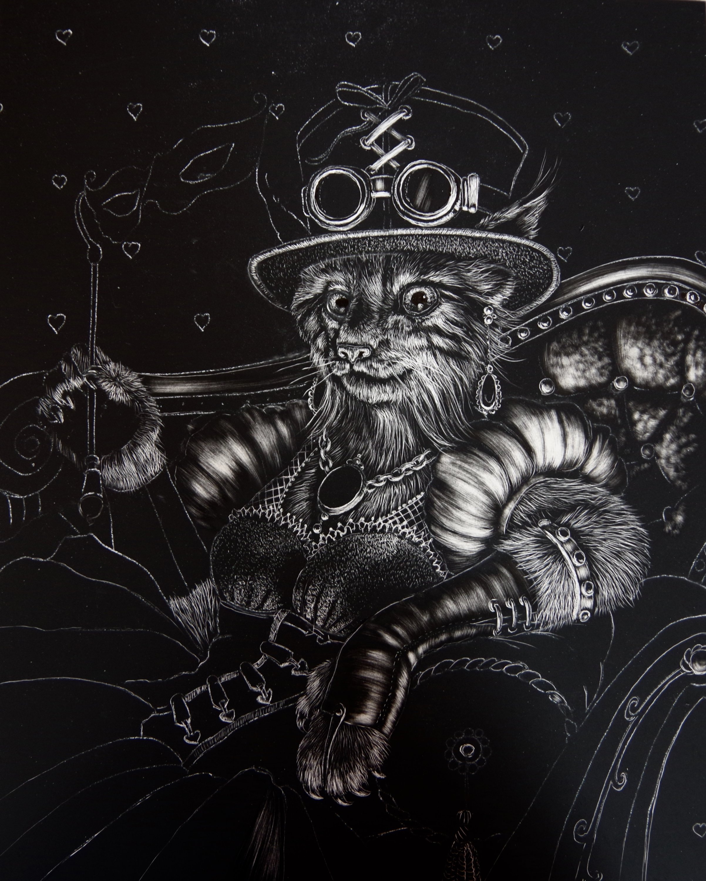 L'accumulation des sgraffites forme graduellement l'image, et donne les effets de modelé aux personnages. C'est à cette étape qu'ils prennent vie et que je m'amuse! Cependant , cette étape est longue et fastidieuse : un panneau de 8 par 10 pouces peut prendre une quarantaine d'heures à réaliser, tout dépendant de la complexité du dessin.